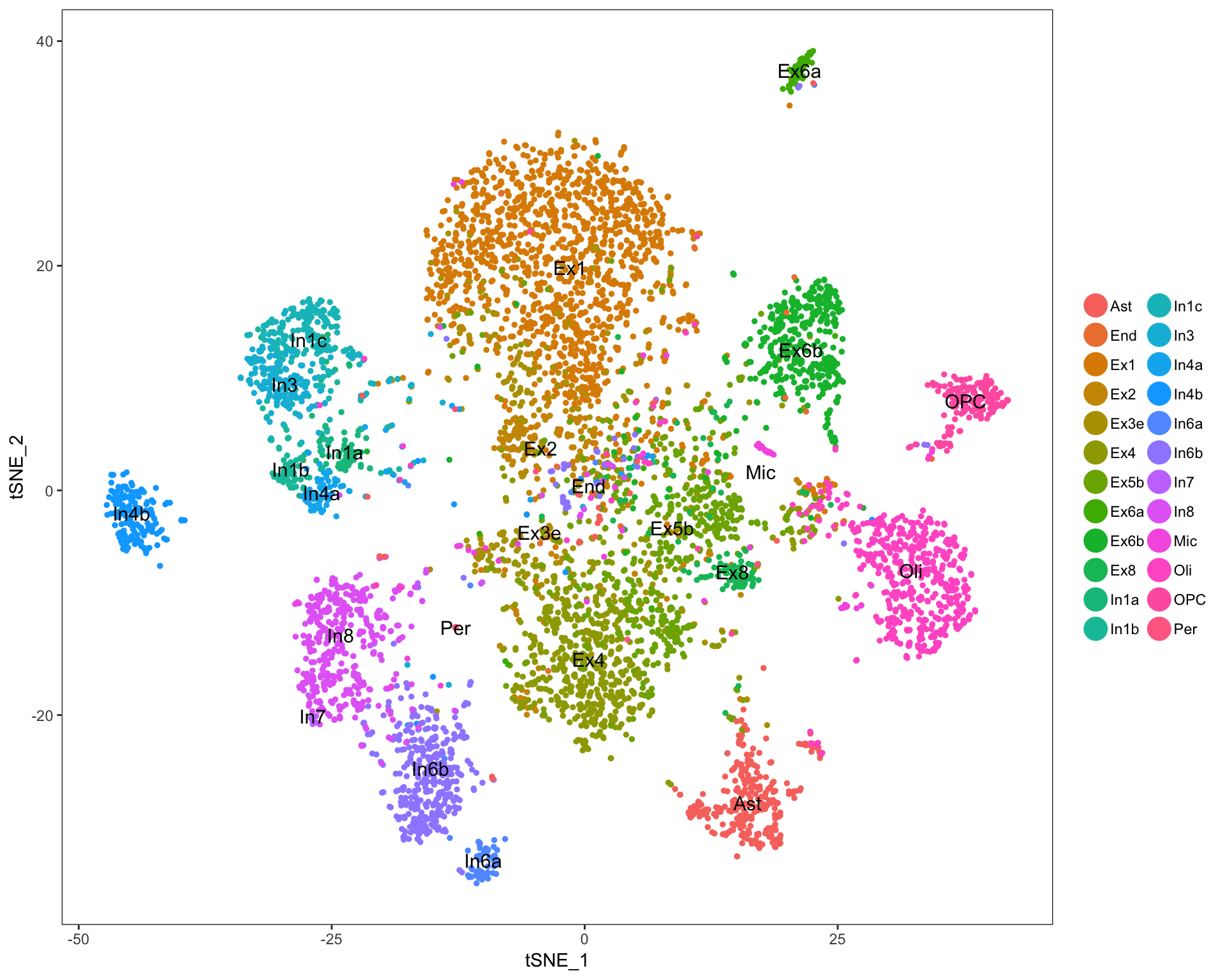 Excitatory (Ex) and inhibitory (In) neuronal subtypes in the cortex; distinct cerebellar granule (Gran) cells and Purkinje (Purk) neurons; and non-neuronal cells, including endothelial (End) cells, smooth muscle cells or pericytes, astrocytes (Ast), oligodendrocytes (Oli) and their precursor cells (OPCs), and microglia (Mic).