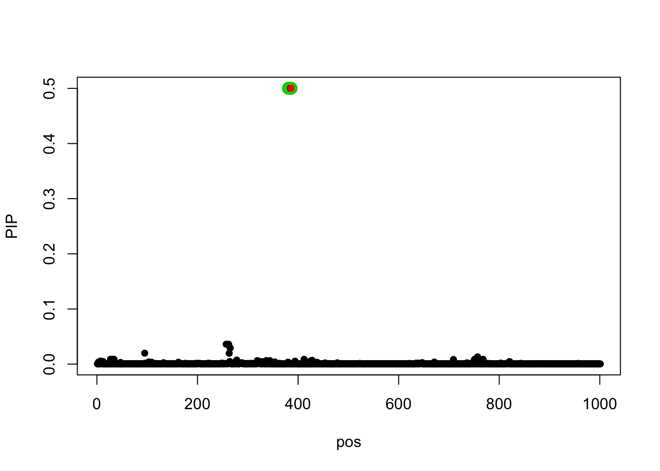 Let’s see an example data with one true effect. The PVE is 0.5, the residual variance is 0.47^2.
