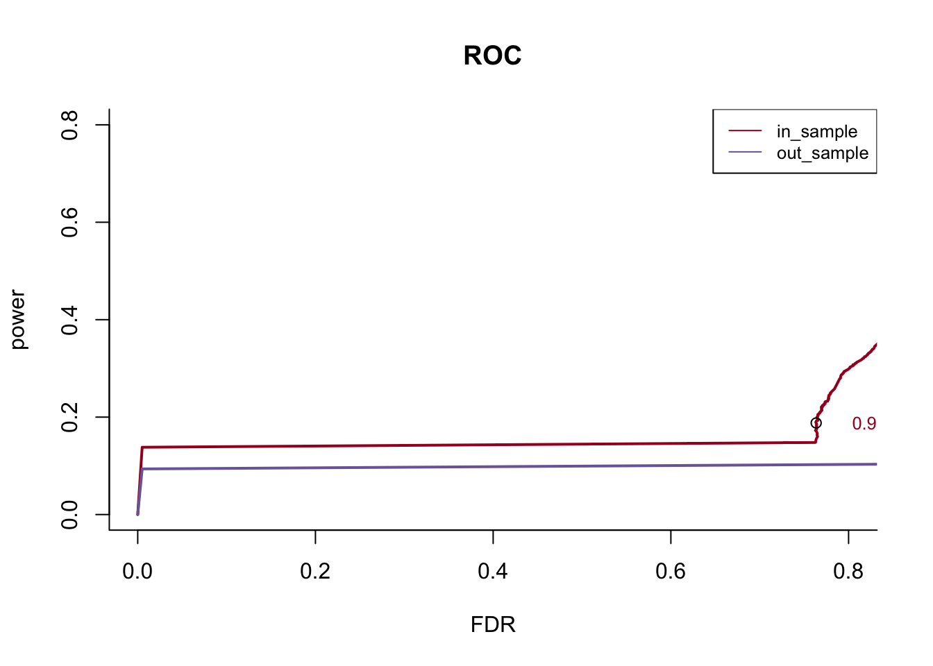 plot(yy$x, yy$y, t="l", col=colors[i], ylab = "power", xlab ="FDR", main = 'ROC', bty='l', lwd = 2, xlim = c(0,0.8), ylim = c(0,0.8))