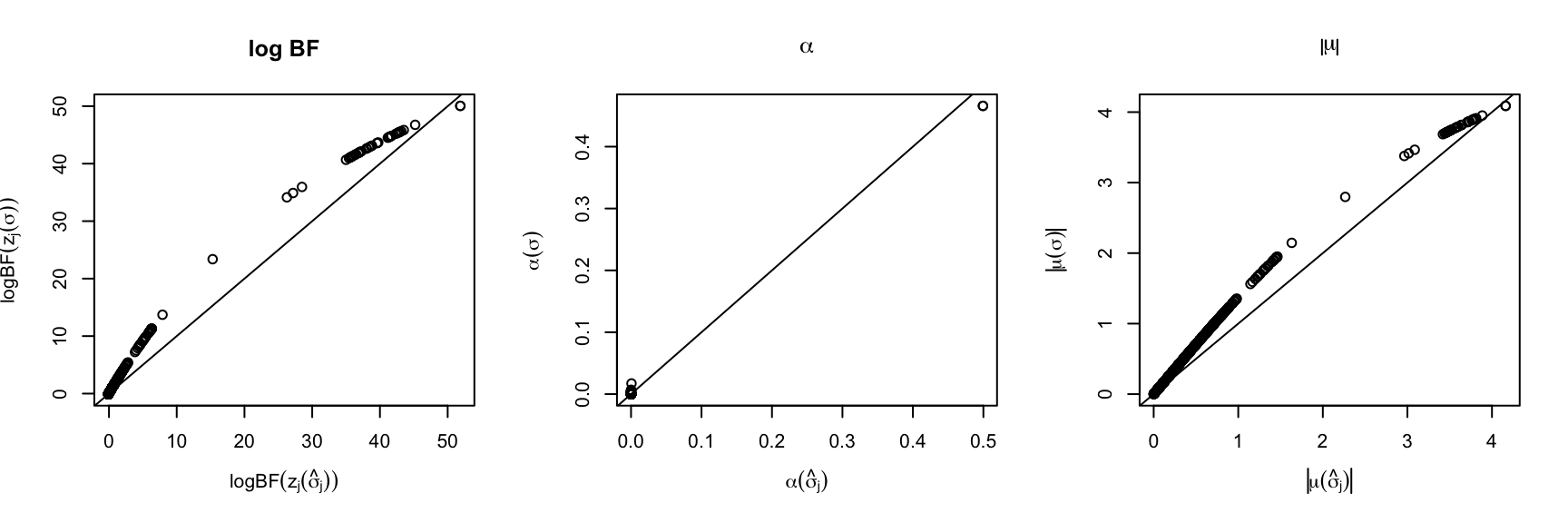 {plot(abs(fit_z_1$mu), abs(fit_z_1_true$mu), xlab = expression(abs(mu(hat(sigma)[j]))), ylab = expression(abs(mu(sigma))), main=expression(abs(mu)))