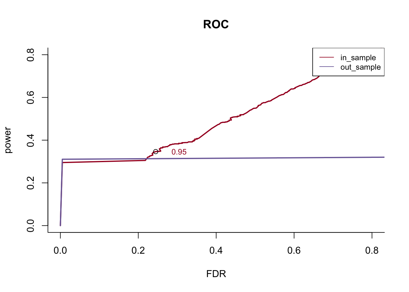 plot(yy$x, yy$y, t="l", col=colors[i], ylab = "power", xlab ="FDR", main = 'ROC', bty='l', lwd = 2, xlim = c(0,0.8), ylim = c(0,0.8))